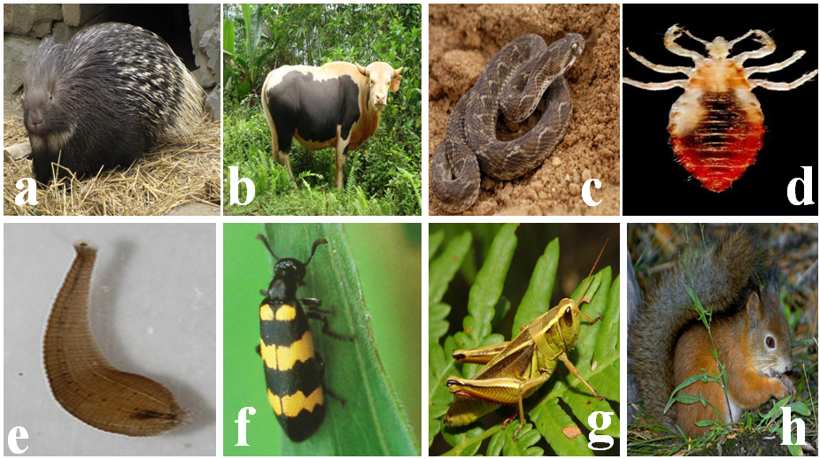 Fig. 5: Representatives of some animals being used in traditional practices by the indigenous people of Karbi Anglong district of Assam. (a) Porcupine, Hystrix sp.; (b) Mithun, Bos frontalis; (c) Viper, Echis coloratus; (d) Louse, Pediculus sp.; (e) Leech, Hirudo medicinalis; (f) Blister beetle, Mylabris cichorii; (g) Grasshopper, Poecillocerus strictus and (h) Squirrel, Sciurus caroliniensis. Photographs were taken from Google image.