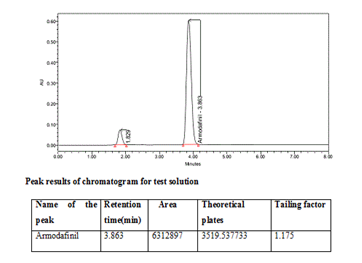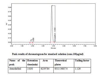 Methods: Chromatography was performed by isocratic elution on a Stainless steel Hibar C18 column with dimensions 4.6 x 250 mm, packed with octadecylsilane bonded to porous silica (C18) with particle size 5 micron. Acetonitrile and water in the ratio of 50:50 v/v is used as mobile phase. The flow rate is 1.0 ml/ min and effluent is monitored at 220 nm. Armodafinil was eluted at a retention time of 3.8 minutes.