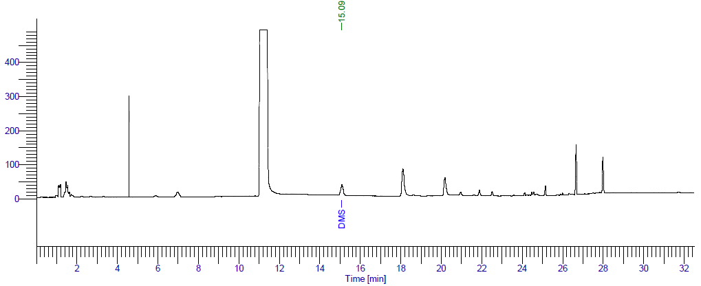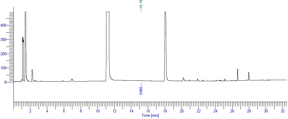 Performed blank followed by standard solution six times, blank followed by two test preparations. Run the chromatograph for 32.5 min and record the chromatogram. The retention time of dimethyl sulfate derivative i.e. anisole is 15.0 min.