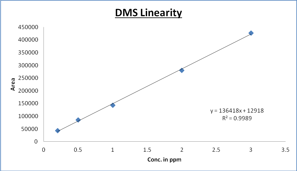 Drug stability in the active pharmaceutical ingredients (API) is a function of storage conditions and chemical properties of the drug and its impurities. The solution stability till twenty-six hours of derivatized DMS had been checked by injecting standard solution. DMS standard solution was prepared fresh before injection and immediately injected and same solution was injected after twenty-six hours. The peak area of DMS of freshly prepared standard solution was observed 280527 and after twenty six hours it was 272834. No significant change in area was observed after twenty-six hours.