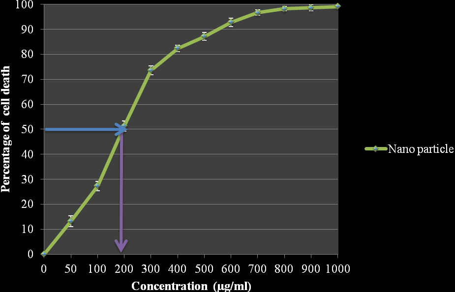 Invitro cytotoxicity of silver nanoparticles synthesized from Indigofera aspalathoids was evaluated on Hep3B cell line. The potential effects of silver nanoparticles synthesized from Indigofera aspalathoids on proliferation and survival of Hep-3B cells, the cells were exposed to 0–1000 μg/ml of silver nanoparticles for 72 h. (Figure 1 and 2) show that silver nanoparticles induces cell death in a dose- dependent manner, as determined using MTT assay. The results shows that silver nanoparticles induces cell death significantly with an average IC50 value of 194.65 ±1.45. Thus, the results shows that the silver nanoparticles inhibits the proliferation of the cell. Silver nanoparticles had important anti angiogenic properties [15], so are attractive for study of their potential antitumor effects. The toxicity of nanosilver on oestoblast cancer cell lines results demonstrate a concentration-dependent toxicity with 3.42 μg/ml of IC50 suggest that the product is more toxic to cancerous cell comparing to other heavy metal ions [16].