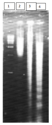 Fig. 6: DNA fragmentation assay showing lane1: marker, lane2: control, lane3:24 hrs treatment, lane 4:48 hrs treatment