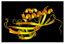 Fig.1: The superimposed structure of modelled protein scytalone dehydratase. The template (scytalone dehydratase with the inhibitor cyanocinnoline) and the target (scytalone dehydratase) were showed in yellow and orange colour, respectively.