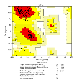 The three dimensional structure of SCD in Colletotrichum lagenarium was modelled by using Modeller 9.13 [19]. The structures of the target and template were superimposed and root mean square deviation (RMSD) value was generated using PyMol tool [20]. In order to obtain the stable structure and to minimize the steric clashes energy minimization was done for the modelled structure using SPDBV [21] and the modeled structure was also validated by SAVES server [22]. Ramachandran plot was analyzed to verify the amino acids present in the allowed and disallowed regions. The active site of the SCD was identified using Q-Site Finder. It predicts the active sites based on the interacting energy between the protein and a simple vander waals probe to locate energetically favourable binding sites [23].