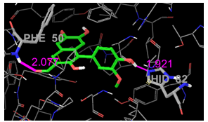 The molecular interaction revealed that five phytochemical compounds have greater binding affinity with the target SCD than the synthetic fungicide. The interactions of those phytochemical compounds with the target SCD was given in Fig.4. Vitrofolal F from the plant Vitex negundo exhibit significant binding affinity with the glide score -11.11 Kcal/mol. Two interactions were observed with the active site residues PHE 50 and HIS 82. The interactions were shown in Fig.4 (a). The compounds atalaphylline, buxifoliadine A resulted in single interaction with the residue HIS82 and the glide score was -10.23 and -8.99 Kcal/mol respectively.