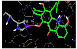 The interaction of these compounds with the residue HIS82 was shown in the Fig. 4(b), Fig. 4(d). These compounds were derived from the plant species Atalantia monophylla. The compound licochalcone A from the plant Glycyrrhiza uralensis Fisch resulted in the glide score of -9.54 Kcal/mol and single interaction was observed with ASN128 which was represented in Fig.4(c). Gingerol from the plant Zingiber officinale Roscoe holds the glide score -8.32 Kcal/mol and it interacted with two active site residues (TYR 27 and TYR 47) of the target SCD, interactions were shown in the Fig.4 (e).