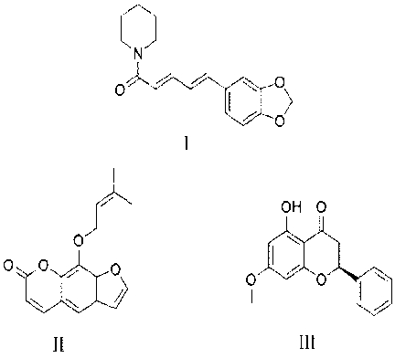 Fig. 1: Chemical structure of piperine (I), imperatorin (II), and pinostrobin (III)