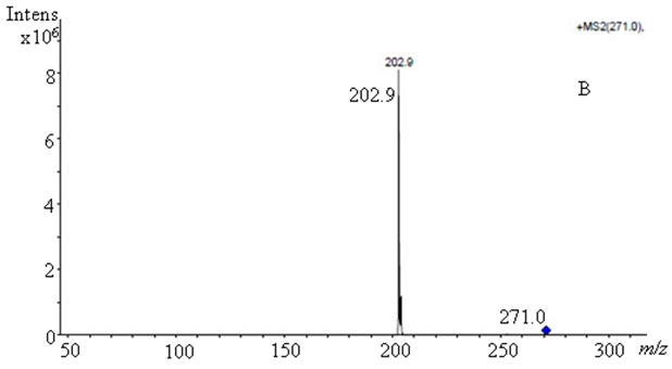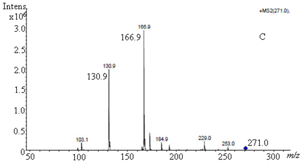 The transition was observed both in the reference and sample solutions for each piperine ([M+H]+ 286.1), imperatorin ([M+H]+ 271.0), and pinostrobin ([M+H]+ 271.0) parent ions to guarantee selectivity and specificity. Each transition had its specific reaction amplitude. First, the piperine transition was [M+H]+ 286.1 to 200.9 with the reaction amplitude of 0.7. Second, the imperatorin transition was [M+H]+ 271.0 to 202.9 with the reaction amplitude of 0.6. Third, the pinostrobin transition was [M+H]+ 271.0 to 166.9, 130.9, and 103.1 with the reaction amplitude of 0.6 (Fig. 2).