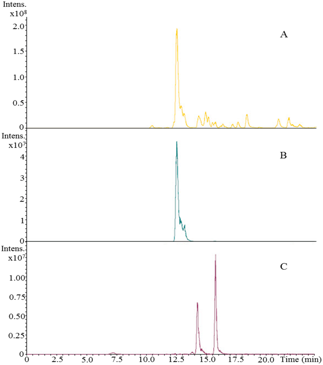 Fig. 3: LC-MS chromatograms of TTAH hexane extract (A), standard piperine at tR 13.0 min (B), standard imperatorin at tR 14.3 min, and standard pinostrobin at tR 15.8 min (C)