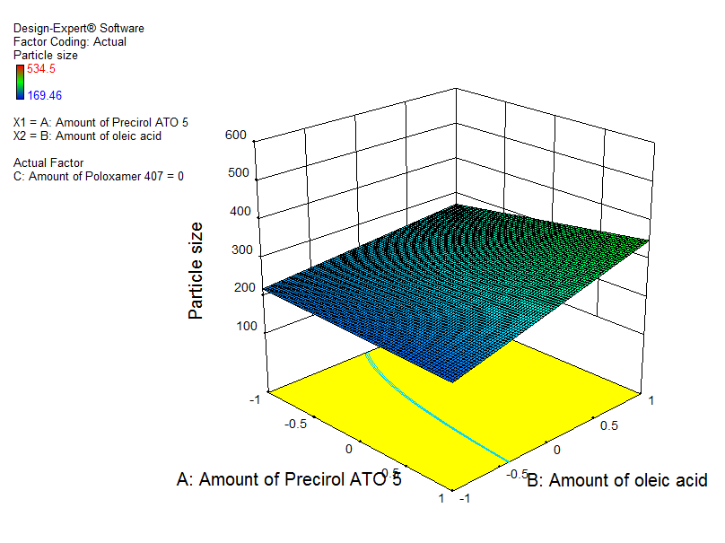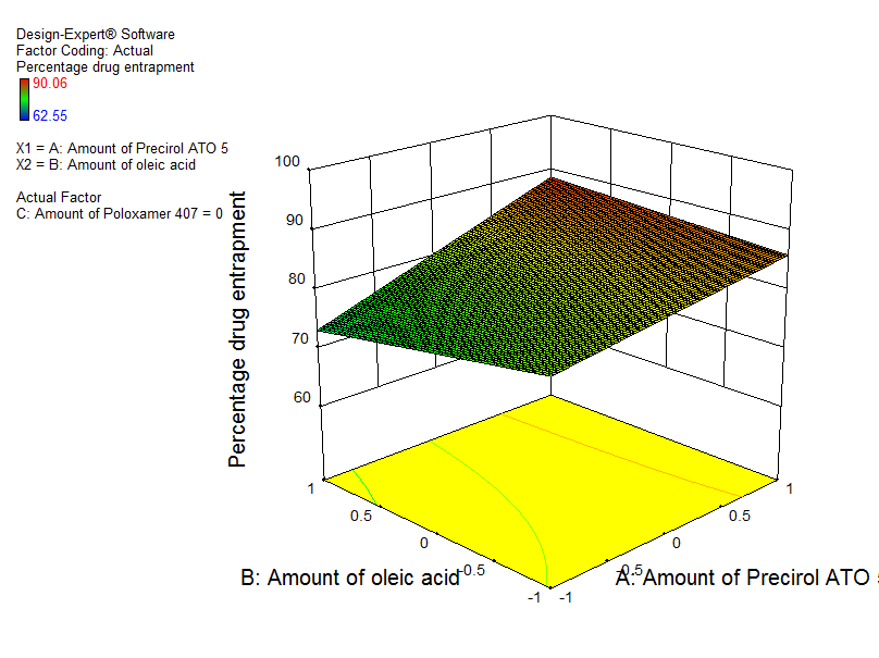 The results of the experimental design were analyzed using Design Expert software. The selected independent variables like the amount of PATO, amount of OA and concentration of P407 had significantly influenced the particle size and, % EE that is very much evident from the polynomial equations. The possible interactions between X1X2, X2X3, and X1X3 for each response were also investigated (fig. 4 and fig. 5).