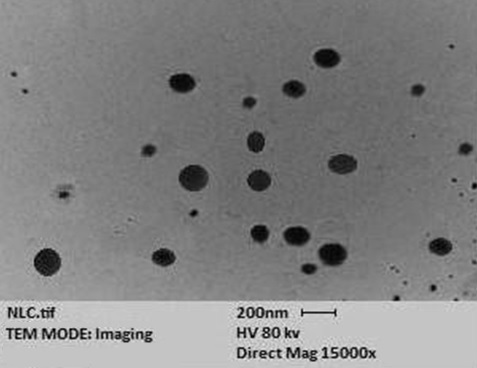 Transmission electron microscopic image of optimized NLC indicated spherically shaped particles with narrow size distribution. No aggregation was observed as shown in fig. 6.