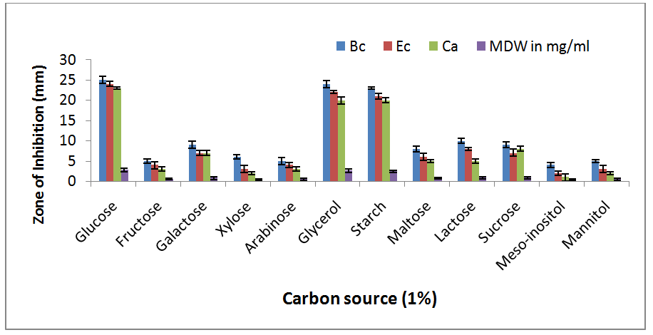 Microorganisms have a capacity to utilize a variety of carbon sources and can adapt to the changes in the osmotic strength nutrients and oxygen limitation and stress conditions [14][15][16]. The presence of carbon source which is easily metabolized, especially glucose, results in a coordinated change of metabolic function in many bacteria [17]. Glucose as a component in the production media provides carbon atoms for the mycelium and produce generations. Maximum antimicrobial compound and mycelium growth was observed with Glucose followed by Glycerol and Starch. In contrast Fructose, Galactose, Xylose, Arabinose, Maltose, Lactose, Sucrose, Meso-inositol and Mannitol showed low antimicrobial compound production and mycelium growth (figure-1).