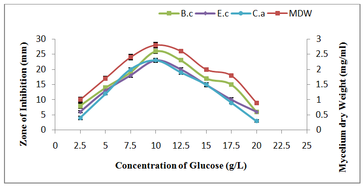 Fig. 2: Effect of glucose concentration on growth and antimicrobial compound production of Streptomyces carpaticus (MTCC-11062)
