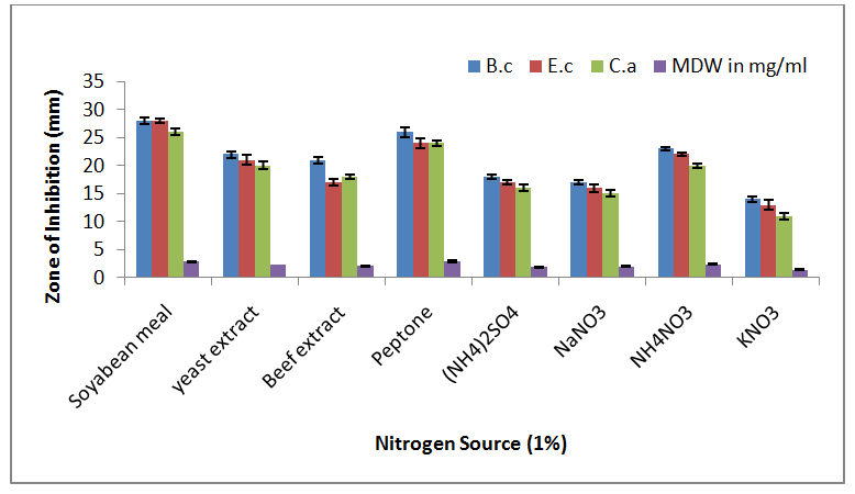 Fig. 3: Effect of different nitrogen sources on growth and antimicrobial compound production of Streptomyces carpaticus (MTCC-11062)