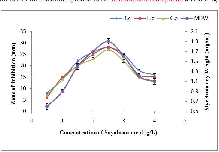 Fig. 4: Effect of Soyabean meal concentration on growth and antimicrobial compound production of Streptomyces carpaticus (MTCC-11062)