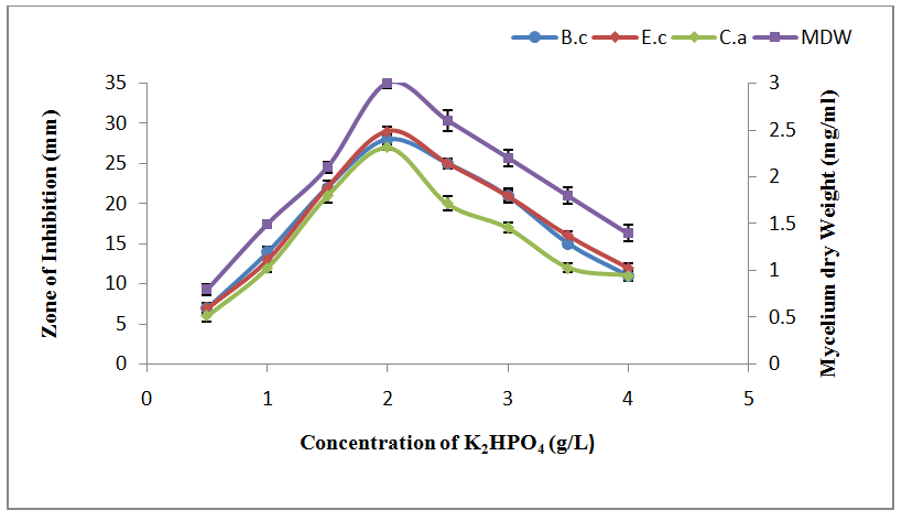 Fig. 5: Effect of K2HPO4 concentration on growth and antimicrobial compound production of Streptomyces carpaticus (MTCC-11062)