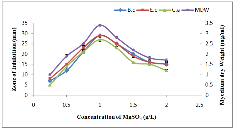 Fig. 6: Effect of MgSO4 concentration on growth and antimicrobial compound production of Streptomyces carpaticus (MTCC-11062)