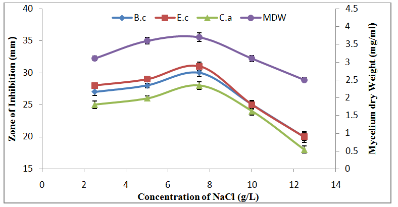 Fig. 7: Effect of NaCl concentration on growth and antimicrobial compound production of Streptomyces carpaticus (MTCC-11062)