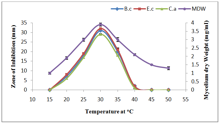 Fig. 8: Effect of temperature on growth and antimicrobial compound production of Streptomyces carpaticus (MTCC-11062)
