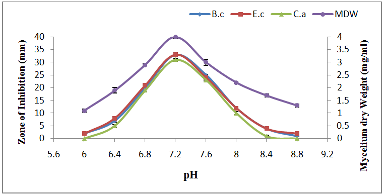 Fig. 9: Effect of pH on growth and antimicrobial compound production of Streptomyces carpaticus (MTCC-11062)
