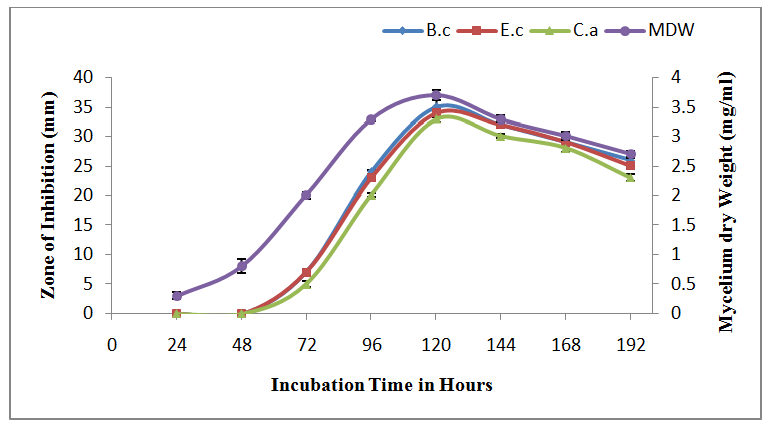 Fig. 10: Effect of incubation time on growth and antimicrobial compound production of Streptomyces carpaticus (MTCC-11062)