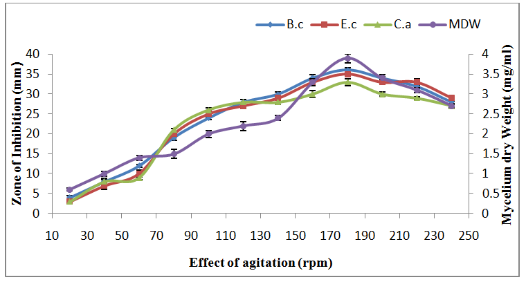 Fig. 11: Effect of agitation on the growth and antimicrobial compound production of Streptomyces carpaticus (MTCC-11062)