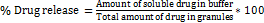 Using phosphate buffer pH 6.2, 0.25 g of prepared granules were dissolved in 100 ml of phosphate buffer and filtered using syringe filter 0.45µm. Then, with appropriate dilution, the amount of drug release after 2, 5, 8 and 12 minutes was measured by UV spectroscopy at λmax 245nm. The percentage of drug release was calculated by equation1: