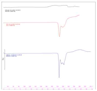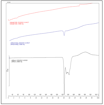 During the preparation of complex, solid dispersion and the organogel and due to the use of solvent system each time, a possibility of chemical or physical interaction may arise. One of the known efficient methods to detect such an interaction is the DSC analysis. The following figures illustrate the DSC analysis of the taste masked granules that contain PBr and the polymers ethyl cellulose (Fig.1), mixture of ethyl and methyl cellulose (Fig.2), β-cyclodextrin (Fig.3), and Eudragit E100 (Fig.4). Thermograms show no additional peaks indication lack of chemical interaction between the drug and the polymers during granules preparation.