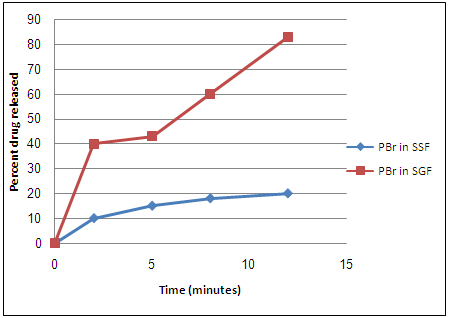 Fig. 5: Percentage of PBr release from E3 taste masked granules in SSF and in SGF.