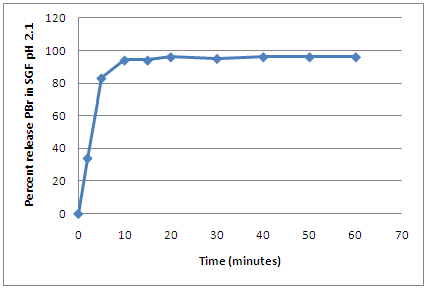Formula T2 was tested for in vitro dissolution to detect the release of PBr in pH 6.8 and in pH 2.1. After 10 minutes, it showed a complete drug release of PBr in phosphate buffer (pH 6.8) as demonstrated in fig. 6. Also in SGF (pH 2.1) high drug release was shown in same time (94%) as displayed in fig. 7. This indicates almost complete drug release in both simulated gastric and intestinal conditions.