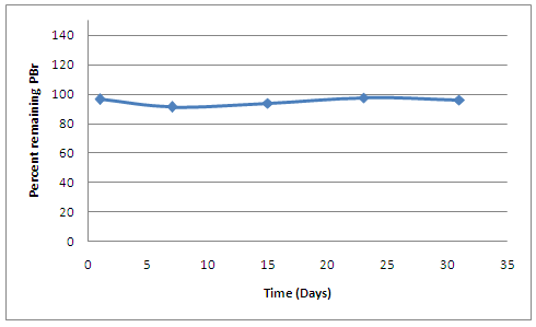 Fig. 8: Percentage remaining of PBr in formula T2 after exposure to 40 ± 2 °C and 75 ± 5 % RH for 31 days.