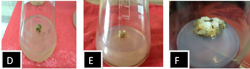 Fig. 2: Callus generated from stem explant using different growth regulators, D-Callus induction from stem supplemented with 2, 4-D (1.0 mg/l), E-Callus induction from stem supplemented with NAA (0.5 mg/l), F-Callus induction from stem supplemented NAA (1.0 mg/l) and BAP (0.5 mg/l)