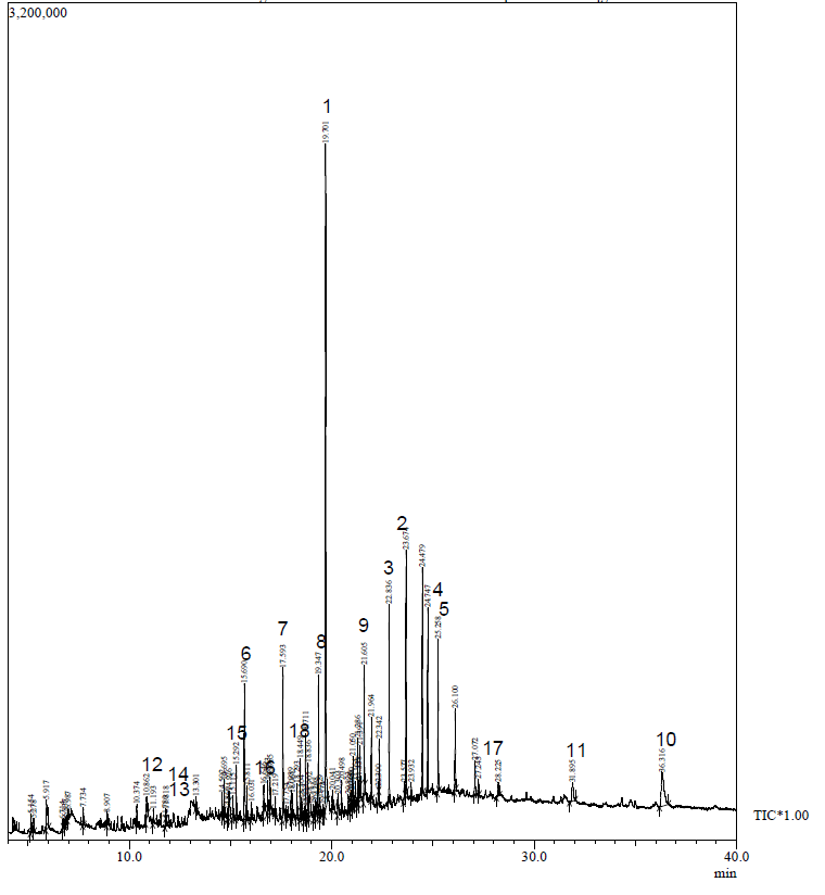 | 5. | 25.258 | 3.38 | Tetracontane |