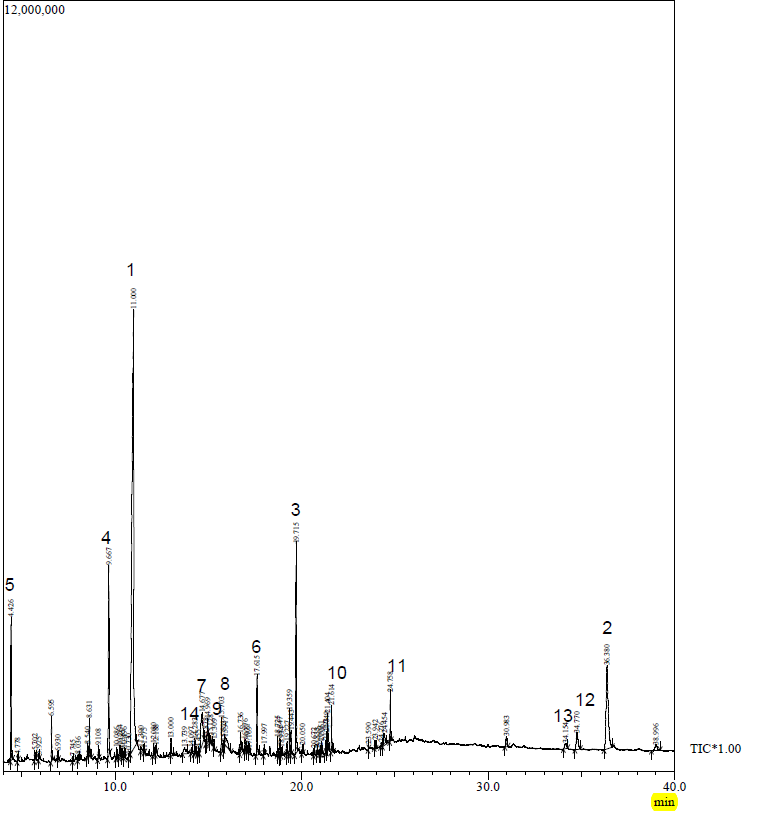 | 14. | 11.818 | 0.22 | Ascaridole epoxide |