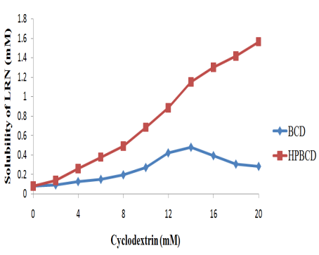 Phase solubility studies were carried out according to the method reported by Higuchi and Connors. An excess amount of LRN was added to stoppered glass vials containing 10 ml aqueous solutions of varying concentrations of β cyclodextrin and Hydroxpropyl β cyclodextrin (0-20 mM) and the suspensions were stirred for 24 h at 37±0.5ºC using temperature controlled water bath (Remi Motors, Mumbai). After equilibrium, the samples were filtered and absorbance was recorded at 376.5 nm using UV/Vis spectrophotometer (Shimadzu UV-1700).