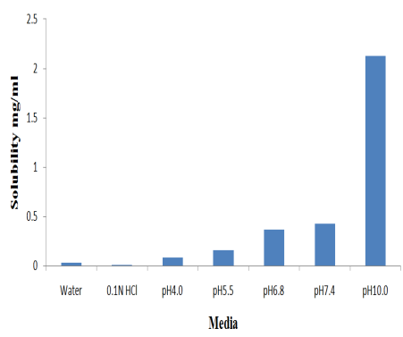 In order to know the effect of pH on solubility of LRN, analogous solubility studies in different media (pH 1.2 - pH 10.0) were also carried out under same experimental conditions. The solubility of LRN in each buffer media was assessed using UV/Vis spectrophotometer at 372.5 nm for acidic media and 377.5 nm for all other media studied.