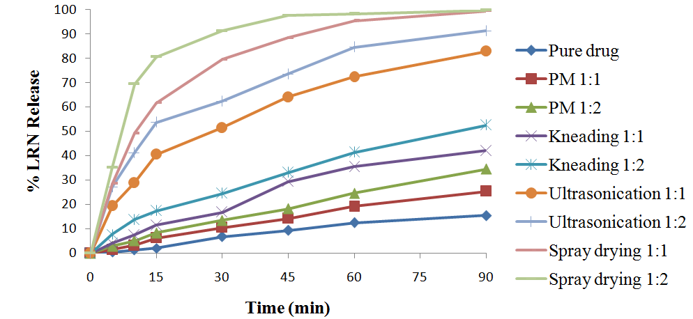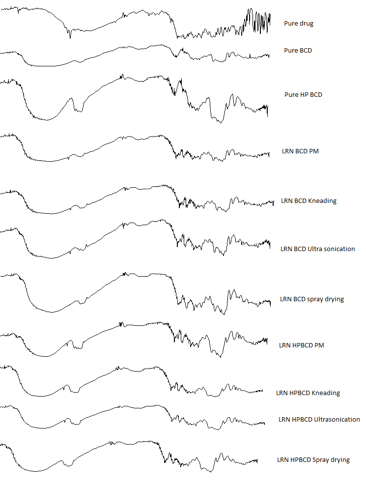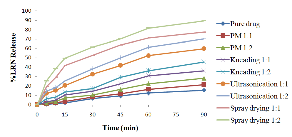 With an aim to improve the solubility of LRN, inclusion complexes with β CD and HP β CD were prepared at two molar ratios (1:1 and 1:2) by kneading, ultrasonication and spray drying methods. Physical mixtures of LRN and CDs in the same molar ratios were also prepared for comparison purpose.
