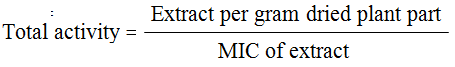 Total activity is the volume at which the test extract can be diluted with the ability to kill microorganisms. It was calculated by dividing the amount of extract from 1g plant material by the MIC of the same extract or compound isolated and is expressed in ml/g [7].