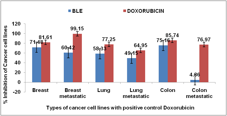 Fig. 1: Percent Inhibition activity for anticancer effects of BLE and doxorubicin drug against cancer cell lines and metastatic cancer cell lines, *±standard deviation with mean, n= 3