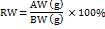 Liver, kidney, spleen, and heart were removed from the euthanized animals, rinsed in 0.9% saline, carefully dissected and weighed on an analytical scale. The relative organ weight (RW) for each organ was obtained with the following formula: