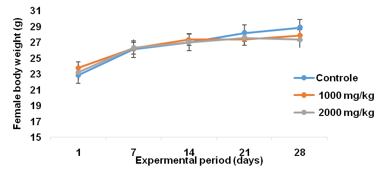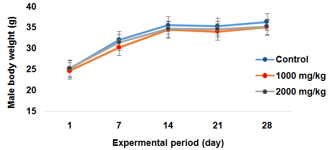 However, the body weight of the female mice was 29.83±0.94 g among the control animals 27.87±0.44 g for female mice treated with 1000 mg/kg and 27.33±0.47 g for the female mice treated with 2000 mg/kg. As shown in fig. 2, no significant (p>0.05) variances were observed between groups [F=1.89, p=0.17]. There were no significant (p˃0.05) changes observed in the body weight of the mice treated with MECN across treatment groups and gender during the study period.