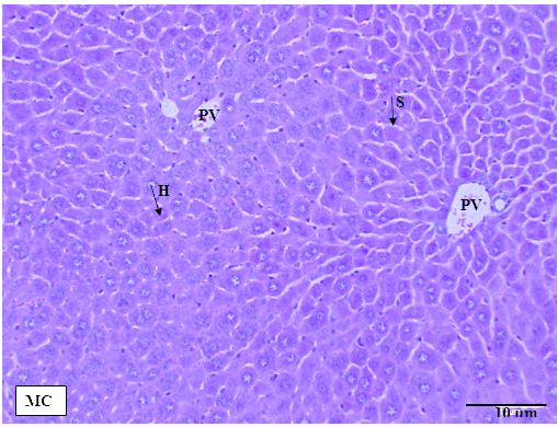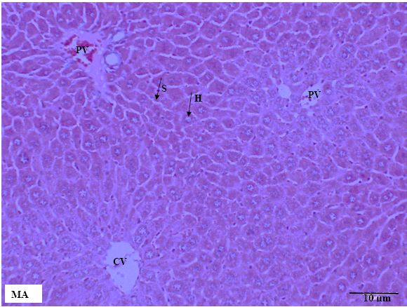 Fig. 3: Liver tissue in male mice across treatment groups. MA: male control group, MB: male mice treated with 1000 mg/kg MECN, MC: male mice treated with 2000 mg/kg MECN. No cellular structural changes were detected in both the treated and control groups. H: hepatocytes, S: sinusoids, PV: portal vein, CV: central vein. (HandE staining, scale bar =10 µm, original magnification x200)