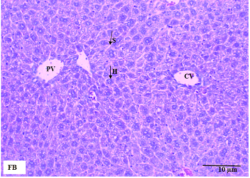 Fig. 4: Liver tissue in female mice across treatment groups. FA: female control group, FB: female mice treated with 1000 mg/kg MECN, FC: femalemice treated with 2000 mg/kg MECN. No cellular structural changes were detected in both the treated and control groups. H: hepatocytes, S: sinusoids, PV: portal vein, CV: central vein. (HandE staining, scale bar=10 µm, original magnification x 200)