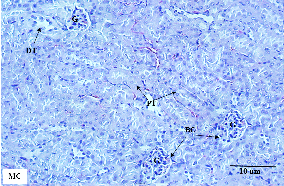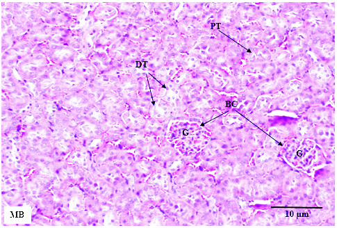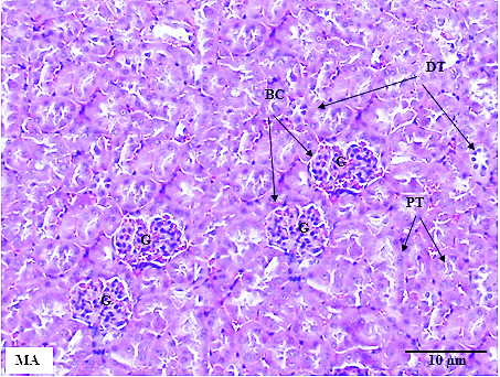 Fig. 5: Kidney tissue in male mice across treatment groups. MA: male control group, MB: male mice treated with 1000 mg/kg MECN, MC: male mice treated with 2000 mg/kg MECN. No cellular structural changes were detected in both the treated and control groups. G: glomeruli, BC: glomerular capsule, PT: proximal convoluted tubule, DT: distal convoluted tubules (HE staining, scale bar=10 µm, original magnification x200)