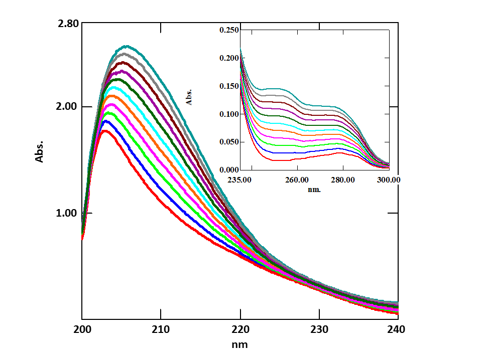 In an initial attempt, we employed UV-Visible spectroscopy towards understanding the binding interactions of HSA with VGC. From fig. 2 it is evident that HSA showed two significant absorption peaks at 200-210 nm and 260-300 nm which are fingerprint regions for the predicting secondary structural changes and the microenvironment of intrinsic chromophores respectively. Sequential addition of 1µMof VGC to the final concentration of 10µM of VGC leads to a gradual increase in the intensity of the absorption peak at 280 nm. Though the increase is very marginal these are significant for understanding the changes in the microenvironment of the aromatic residues. Secondly, there is a marginal red shift in 200-210 nm along with the increase in the intensity of the absorption. This result suggests that the polarity of aromatic amino acid residues, particularly trp-214, protein backbone conformation and α-helix content of HSA might be slightly altered with the addition of VGC. To further elucidate and to affirm structural changes of HSA during interaction with VGC, Circular dichroism (CD) studies were employed.