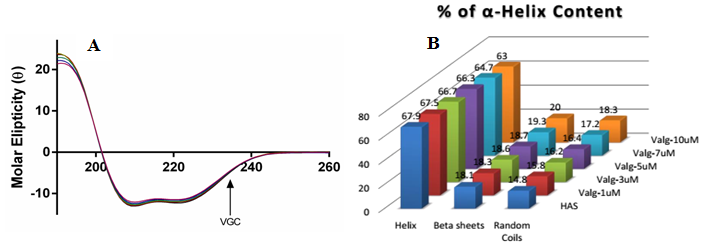 Fig. 3: CD Spectra of A) HSA (1µM) with varying concentrations of VGC (1-10µM) B) secondary structural changes of HSA in the presence of VGC (1-10µM)