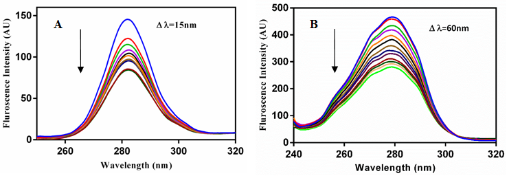 Fig. 4: Synchronous spectra of VGC with HSA A) ∆λ=15 nm and B) ∆λ=60 nm with increasing concentrations of VGC (1-10µM)