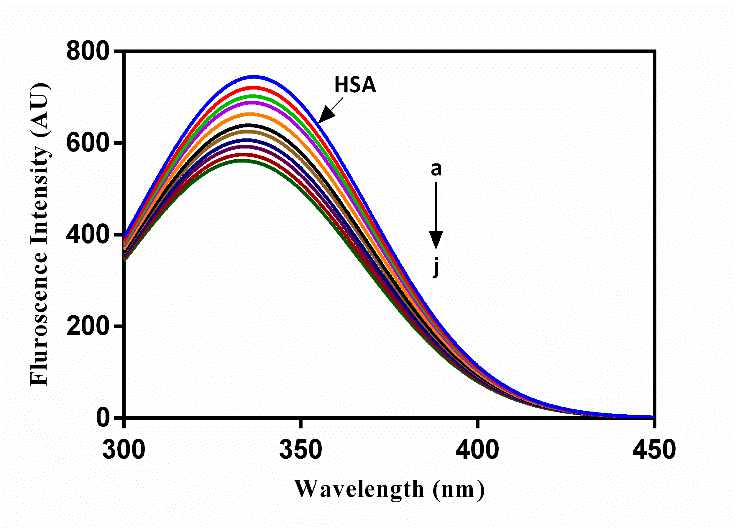 Fig. 5: Fluorescence spectra of HSA in the presence of increasing concentrations of VGC (1-10µM)