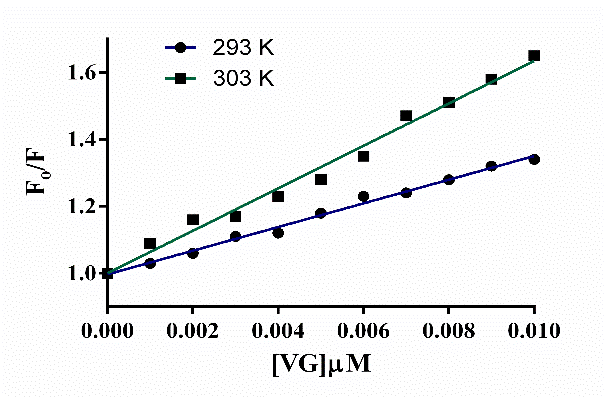 From the plot of Fo/F vs [VGC] the stern-volmer quenching constant was found to be 3.4 x 1012 M-1s-1 and is far larger than maximum diffusion collisional quenching rate constant for various quenchers in the presence of biopolymers 2.0 x 1010 M-1s-1.