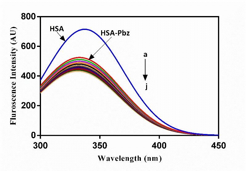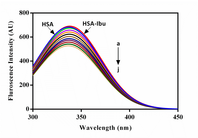 Besides the above techniques that were mentioned and discussed, fluorescence spectroscopy provides an excellent platform for screening and understanding the nature of binding interactions between protein and small molecules by taking advantage of intrinsic fluorophores such as tryptophan, tyrosine, and phenylalanine. Presence of single tryptophan residue in the given protein is fairly enough for performing fluorescence since it is having high quantum yield when compared to other amino acids. In addition to understanding the binding interactions, binding constants, binding sites, and the effect of temperature on the binding mode can also be evaluated with the aid of this technique. Hence in the present study, we adopted and employed this technique for further screening of binding interactions of HSA with VGC.